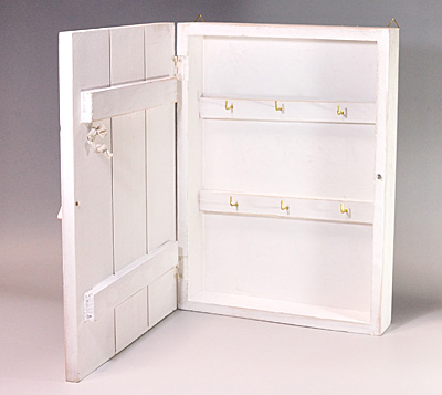 壁に掛けるタイプのキーボックスです。本体背面に、釘や木ネジの頭に引っ掛ける金具が付いています。 扉を開いた内部には、フックが全部で6個付いています。