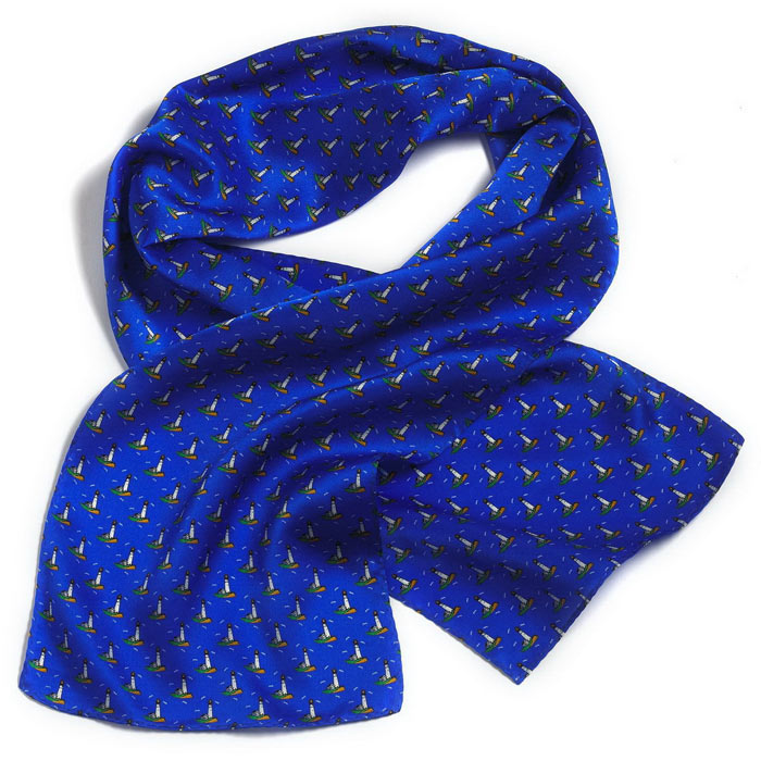 地のブルーは国際信号旗柄、ヨット柄のネイビーと比較して明るく鮮明な色をしています。灯台の白は彩度を落として描かれていますので全体としては落ち着いた雰囲気で襟元を包みます。